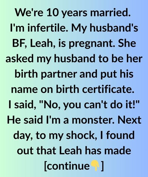 Leah got pregnant after a short relationship with a guy who bailed the moment she told him. Now, weeks from her due date, she asked my husband to be her birth partner. That alone already made me feel weird, but then came the real kicker: she wants him to be on the birth certificate.