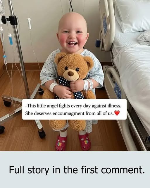 A powerful and emotional photograph has touched the hearts of thousands online. It shows a young girl in hospital attire standing by her bed, clutching her beloved teddy bear. Despite the visible signs of medical treatment—tubes and wristbands—her face beams with a pure, joyful smile.