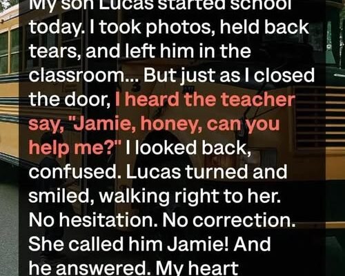 I walked Lucas in alone, and as I returned with his water bottle, I overheard his teacher warmly calling him “Jamie.”