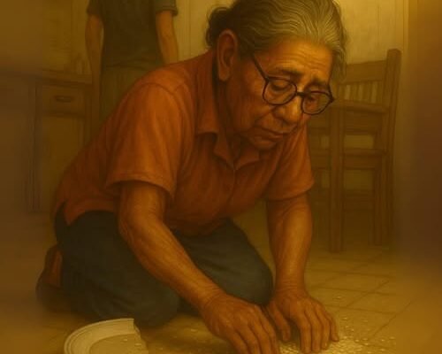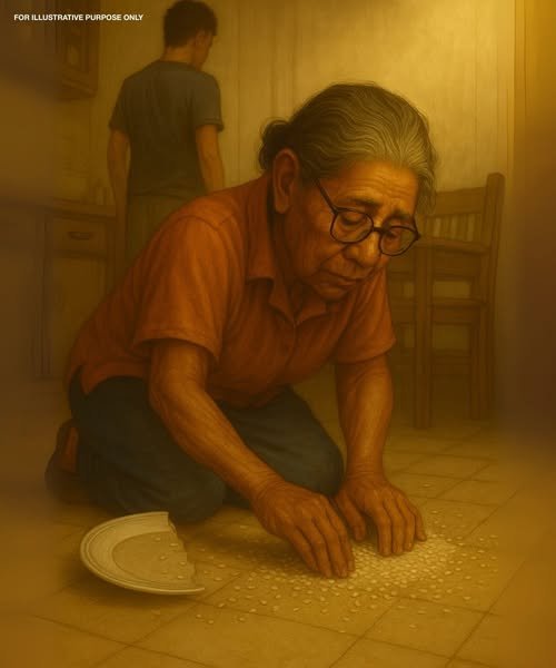 She kept silent. She only bent down, trembling, gathering the grains with her fingers. As though desperate to save what little was left… of food and dignity.