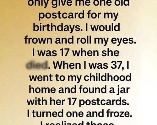 Two decades later, while helping my parents clear the attic, I discovered a jar marked “For You.” Inside lay the very same postcards my grandma had once given me. Intrigued, I flipped one over — and froze. On the back was handwriting that wasn’t just a birthday wish. It was a clue.