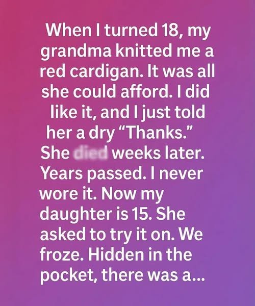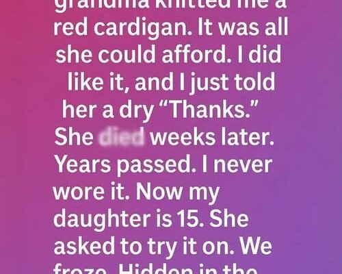 Life carried me forward—college, marriage, and eventually motherhood. The cardigan stayed untouched, tucked away like a secret memory I wasn’t ready to deal with. Then, while cleaning one afternoon with my fifteen-year-old daughter, she stumbled across it.