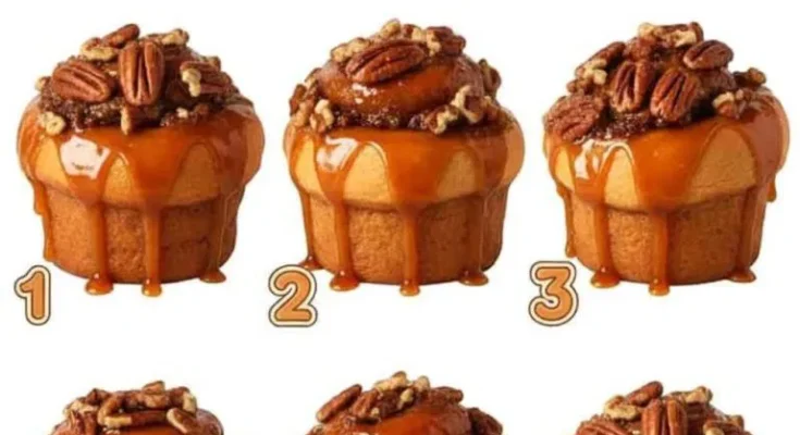 The simplest difficulties that spark conversation on the internet might occasionally surprise us. Six sweet buns dripping with caramel and topped with pecans make up today’s puzzle, which simultaneously looks delectable and challenging. The assignment? Select the two sticky buns that are the same.