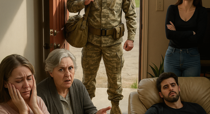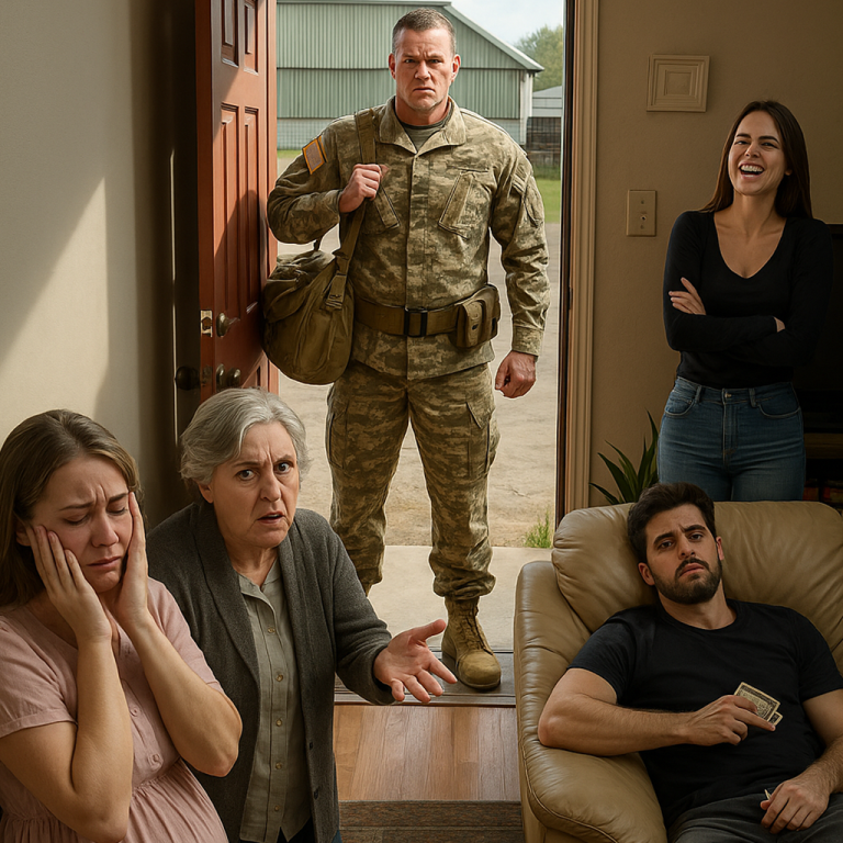 My husband stood in full uniform, duffel on his shoulder, cap tucked under one arm. For one breathtaking heartbeat, his face was pure joy—he’d come home early to surprise me. Then his gaze swept the room: his mother’s raised hand, Monica’s curled lip, Brett’s fist full of cash. The joy burned away.
