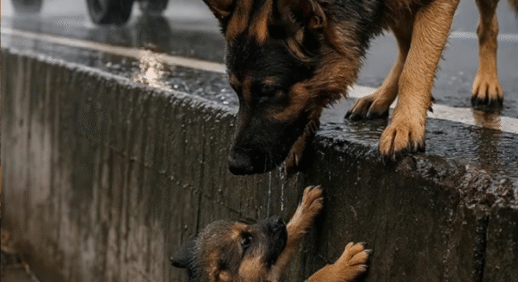 Instead of simply taking her pup and retreating into the storm, the German Shepherd looked at me. Not just a glance—her gaze locked onto mine, deep and unwavering. Then, with deliberate steps, she nudged her pup closer to me, as though presenting him.