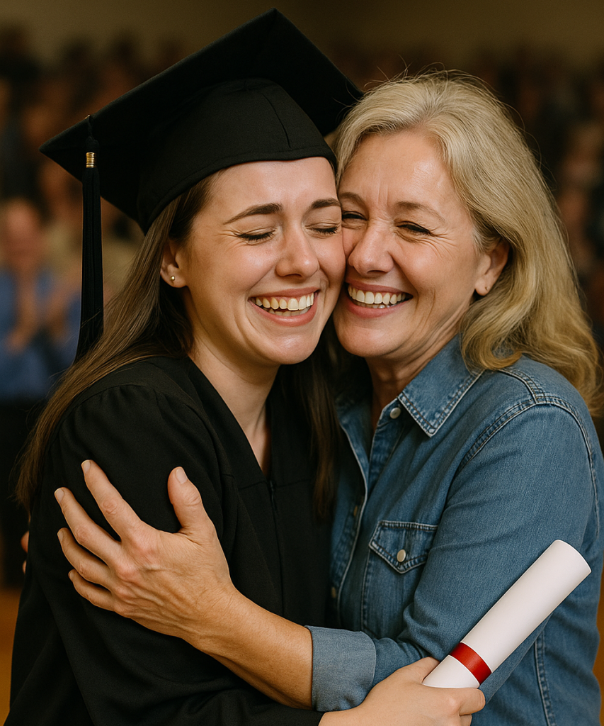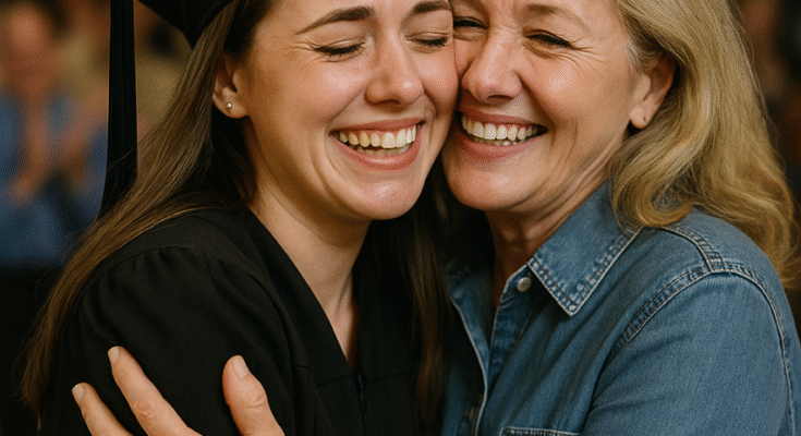 From the back row, her mother sat in her old work clothes — her hands calloused, her hair streaked with gray, a proud smile lighting up her face.