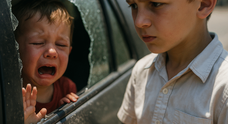 As he crossed the street, something caught his eye. A gray car was parked by the curb. Inside, on the passenger seat, sat a small child, not much older than his little brother. The child was crying, pounding weakly against the glass, his voice hoarse from calling for help. His cheeks were flushed, and his breath came in uneven gasps. The heat inside the car was unbearable.