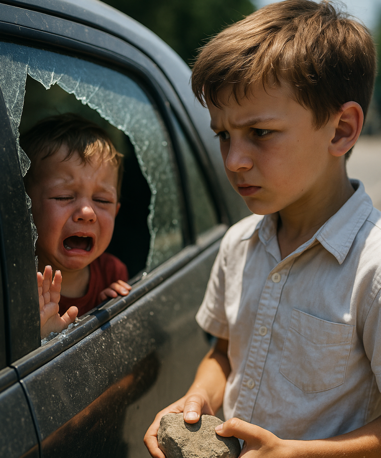 Without another moment of doubt, the boy grabbed a heavy stone from the ground. With all his strength, he struck the window. The glass shattered, and the car alarm blared through the street. Reaching inside, he carefully pulled the trembling child out.