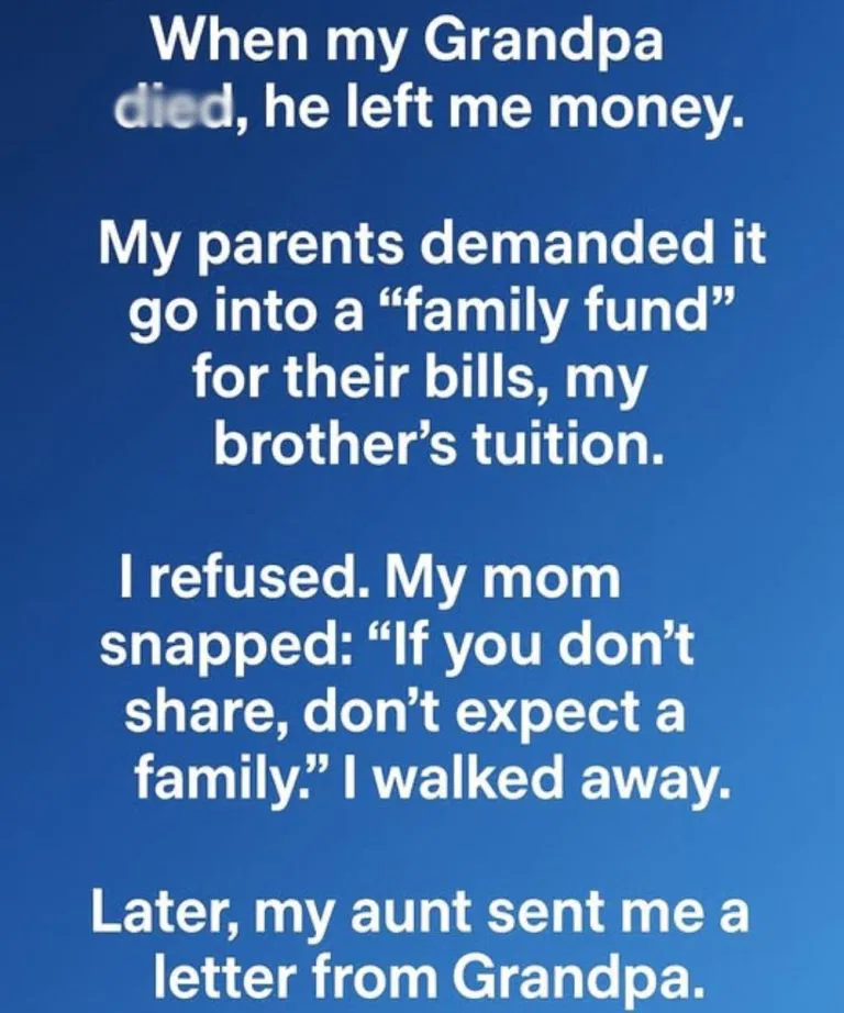 Almost immediately, my parents suggested it should go into a “family fund” to help with household bills and my brother’s college costs. They insisted it was the sensible, mature choice and when I hesitated, their disappointment felt like a weight on my chest. I’d always been the accommodating one, the peacemaker, the child who never wanted to cause trouble. But something about this inheritance felt different, almost personal… as if it carried a purpose only he and I would understand. Feeling overwhelmed, I stepped back from the argument.